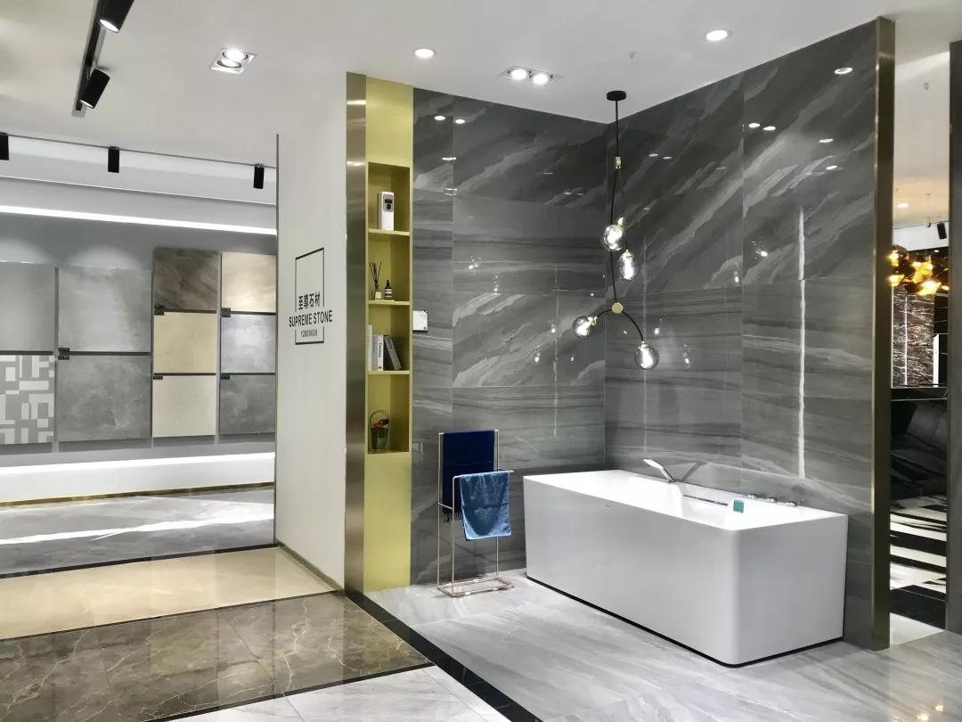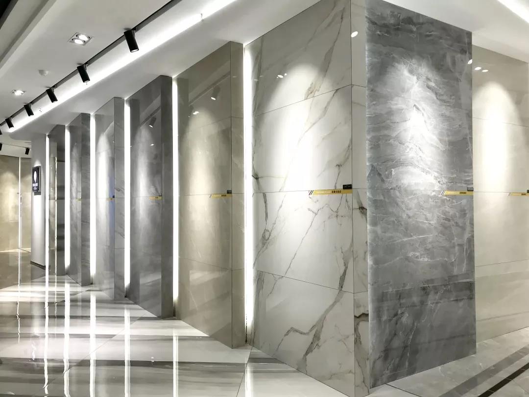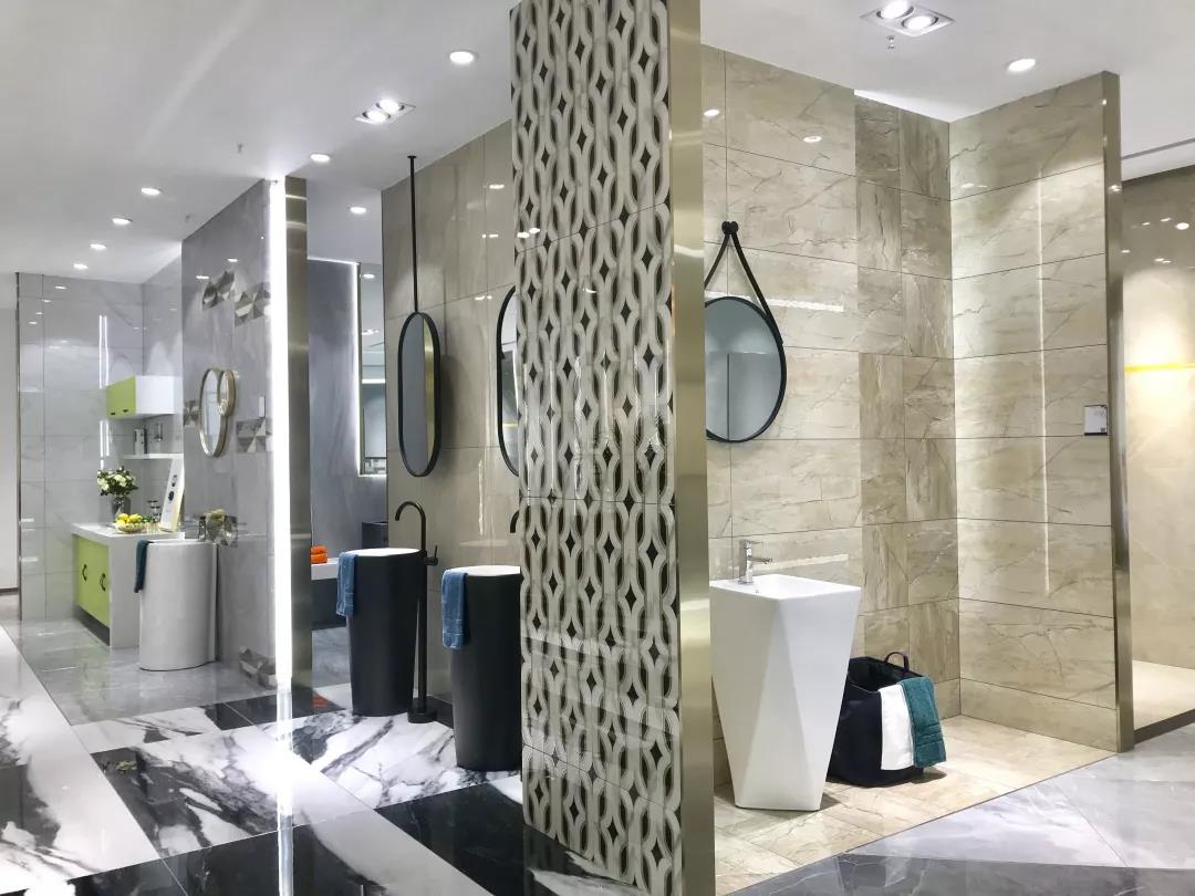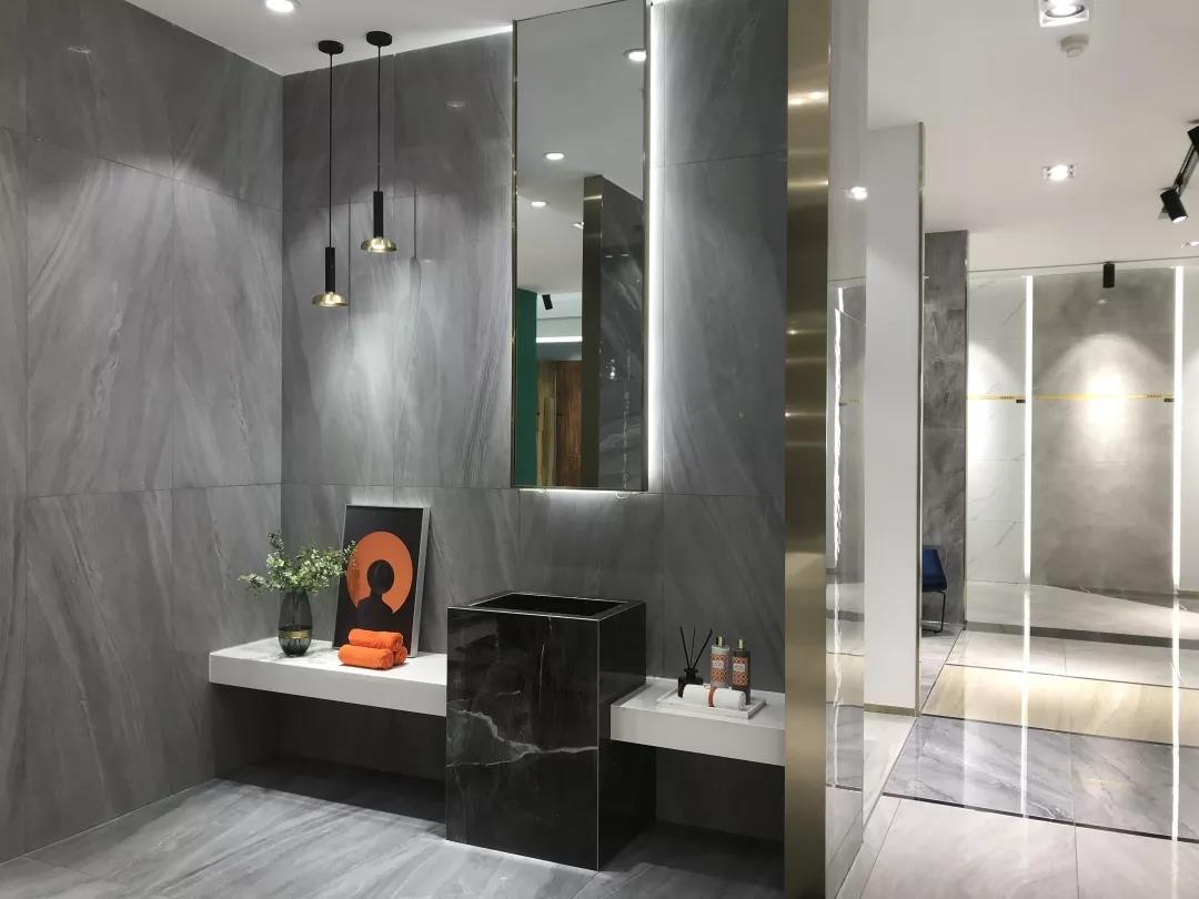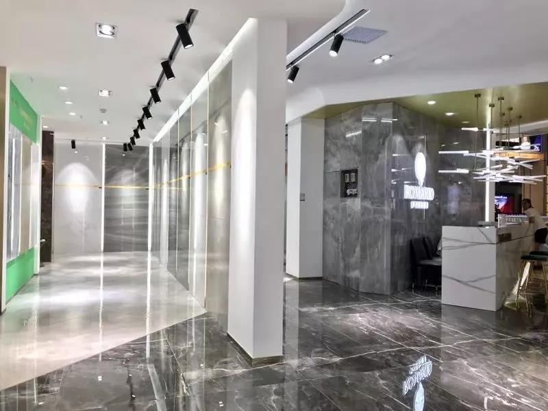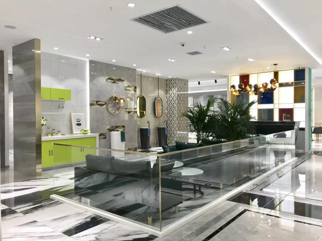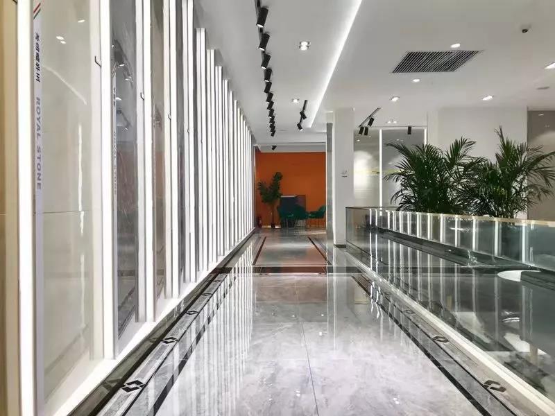 全開放式大門,地磚上“ROMARIO”logo格外醒目,盡顯水刀切割的魅力,左側為墨色與淺藍渲染而成的水素年華,放眼望去,清澈明朗,簡奢風盡收眼底。