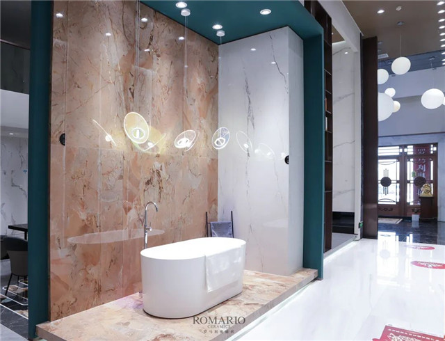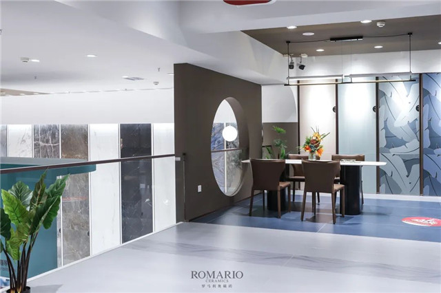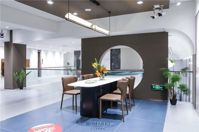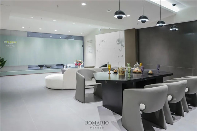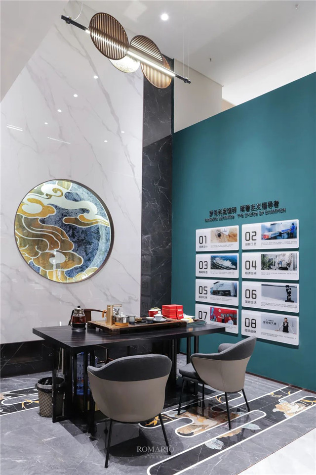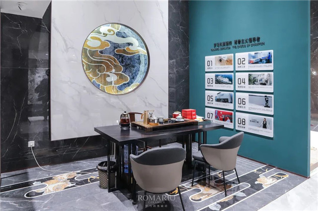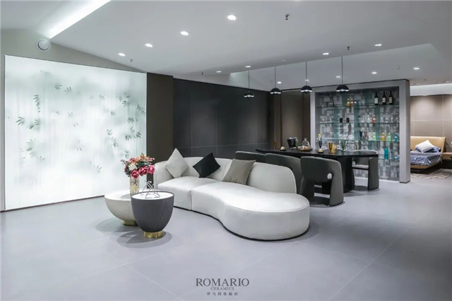 此處現代國際范客廳體驗區更是彰顯羅馬利奧產品的純粹之美,750*1500MM規格的雪山銀狐背景墻以極簡的鋪貼方式出現,搭配以至尊玻利維亞藍、至尊海洋之心產品水刀切割組合的半弧圖案,讓空間更顯活潑、更具特性。