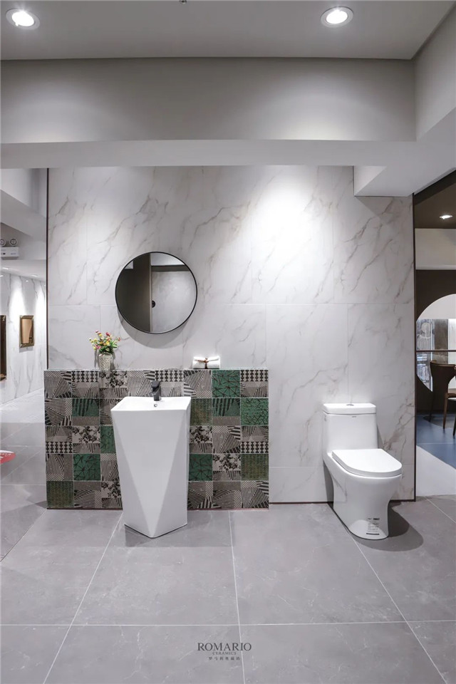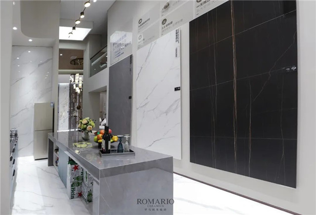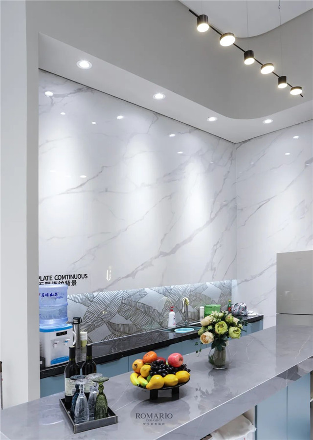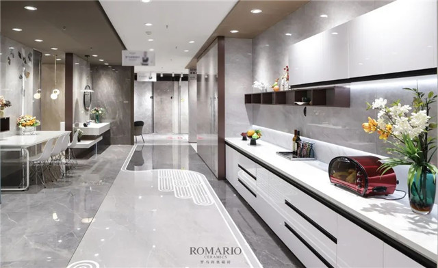 區域劃分清晰,動線流暢,恣意灑脫的至尊千山暮雪作為墻面裝飾,自然靈動的至尊保加利亞灰作為廚房工作臺的飾面,完美復刻石材美感,此處廚房體驗區更是彰顯羅馬利奧磁磚的多維應用,滿足業主對于高品質廚房的各種想法與期待。