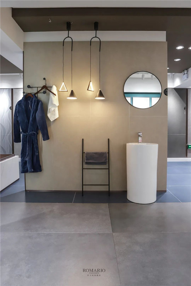 高級灰色的卡穆灰作為墻面鋪陳,簡潔的設計線條豐富空間的層次,幾何吊燈的出現增添衛浴體驗區的活力,視覺上高雅別致。