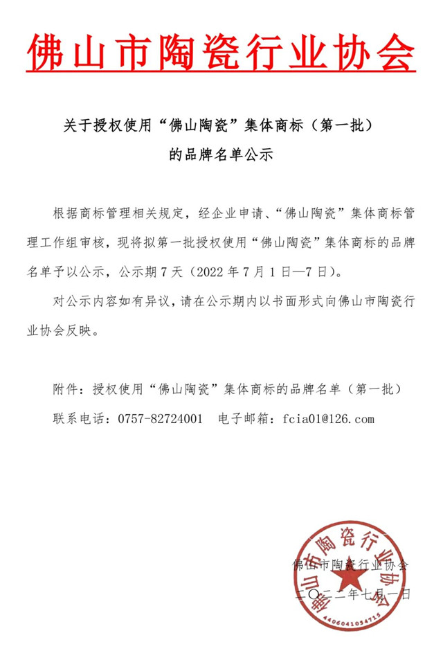 近日,佛山市陶瓷行業協會公示授權使用“佛山陶瓷”集體商標的第一批品牌名單。羅馬利奧從1999年誕生至今,硬核堅守佛山產品品質以及樹立優良的口碑,榮譽上榜首批佛山陶瓷商標授權品牌!
